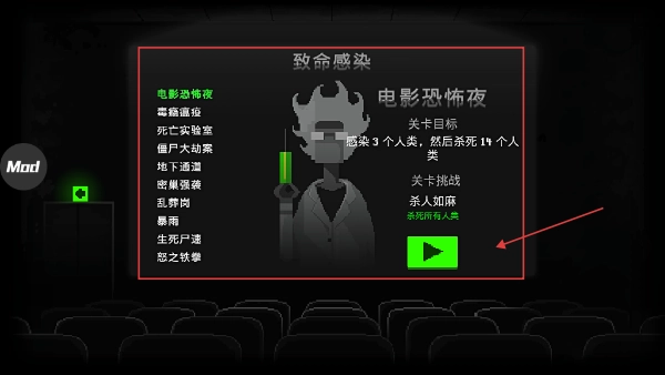 进入【致命感染】里的【电影恐怖夜】关卡,点击绿色的播放按钮就能开始游戏,需要先按目标感染3个人,之后再击杀剩下的人类。