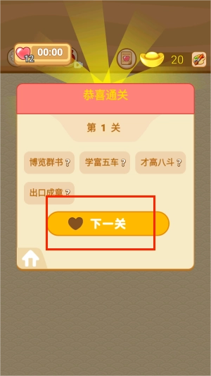 当所有四字成语都被完整准确地补充好之后,系统就会播放庆祝动画,并且自动解锁难度更高的后续关卡内容。