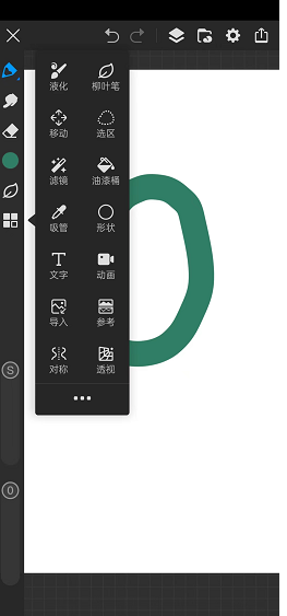 在画世界pro的左侧,有一个单行工具栏。从顶部开始依次排列着 “画笔工具”、“涂抹工具”、“橡皮擦工具”、“调色盘”、“柳叶笔”、“剪切/复制”、“变形工具”、“文字工具”、“工具箱”、“液化工具”、“移动工具”、“滤镜”、“填充工具”、“吸管工具”、“动画制作”、“导入图片”、“参考图片”、“对称工具”、“透视网格” 以及 “工具箱(四叶草)”。在该工具栏的下方,还设有调整笔刷 “大小” 和 “不透明度” 等参数的进度条。