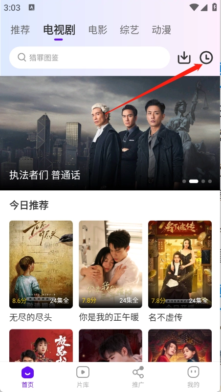 进入首页之后点击右上角的历史。