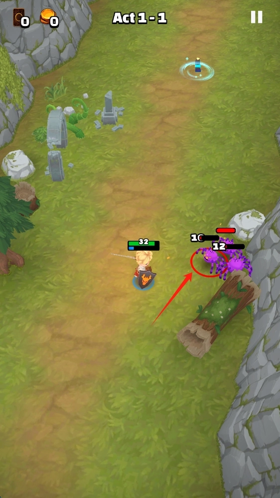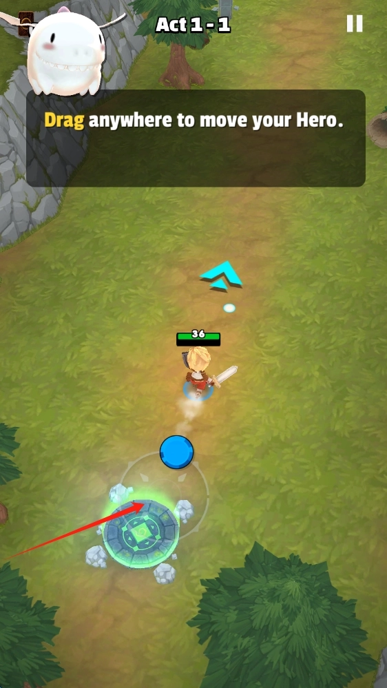 游戏开始后,按照提示拖动屏幕的任意位置,就能操控英雄朝着绿色光圈的方向移动,从而开启Act-1-1关卡的冒险之旅。