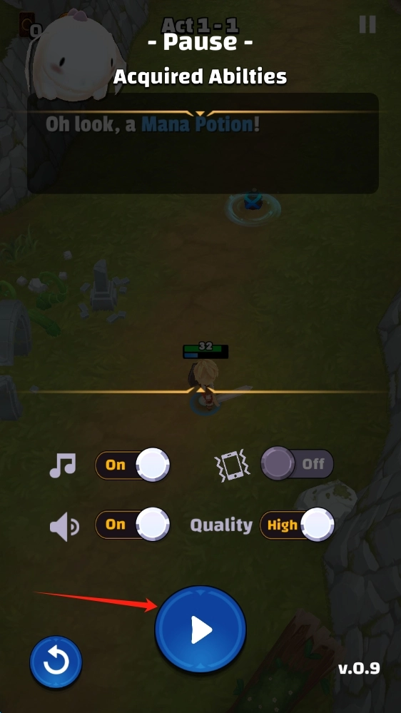 在暂停界面中,你可以对音乐、音效等各项设置进行调整。完成设置确认后,只需点击蓝色的播放按钮,就能继续推进Act-1-1关卡的探索与战斗进程。