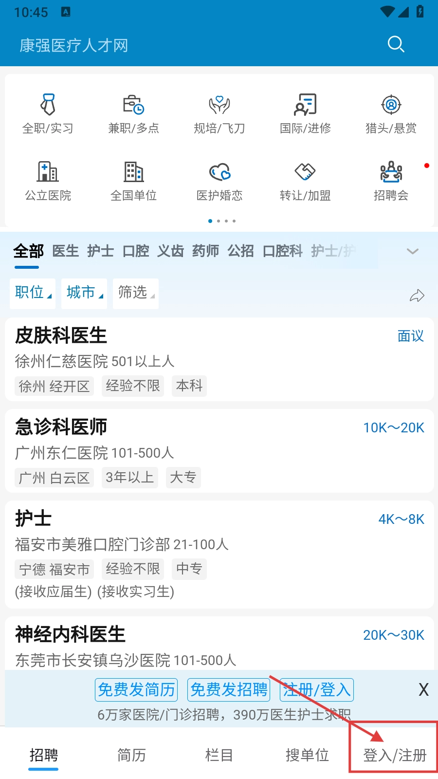 进入【康强医疗人才网】的主界面后,找到页面右下角的【登入/注册】按钮并点击,即可启动账号相关的操作流程。