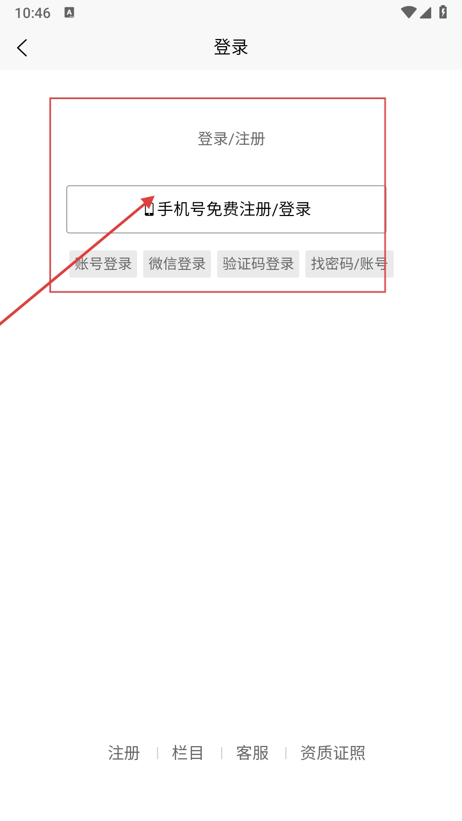 在登录页面,点击【手机号免费注册/登录】的选项,即可进入手机号登录注册的流程。