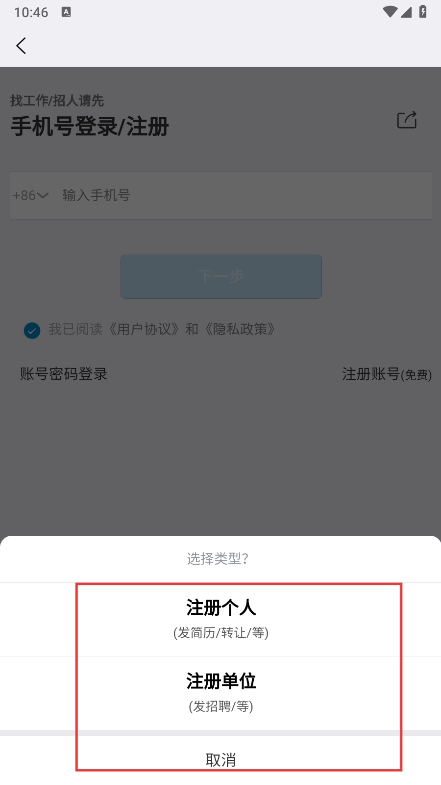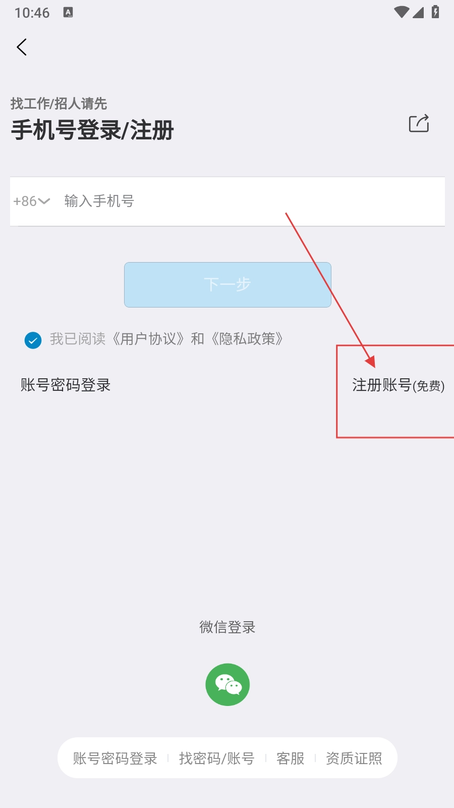 在手机号登录或注册的页面,点击“注册账号(免费)”按钮,即可进入注册类型的选择环节。