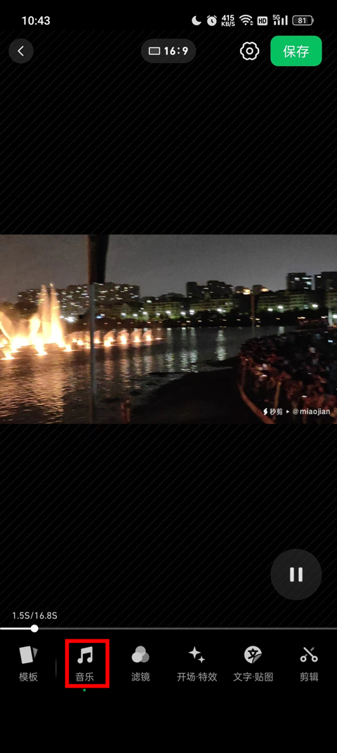 添加视频进入到编辑页面之后,选择下方的音乐。