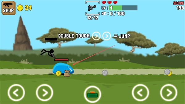 控制火柴人移动,连续按两次左右方向键能跳跃,攻击蓝色的敌人,收集金币。