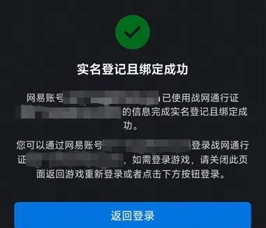 网易账号已通过战网通行证的信息完成实名登记并绑定成功,点击返回登录按钮回到战网通行证登录页面,使用网易账号登录就可以了。