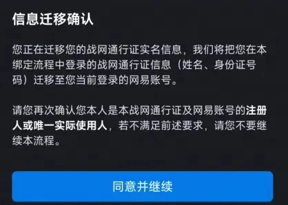 现在启动实名信息迁移流程,请先仔细阅读绑定操作步骤与账号绑定协议,确认无误后点击“同意并继续”按钮。