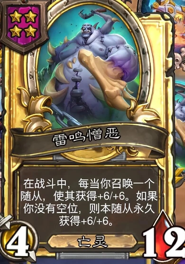 雷鸣憎恶堪称亡灵体系的核心战力卡,其效果为:战斗阶段召唤随从时,会为该随从增加3点攻击力与3点生命值;若场上无空余随从位,则自身获得3/3的属性加成。合金升级后,这一效果将直接翻倍。它不仅能与亡灵的亡语、复生机制形成联动,通过buff召唤出的小亡灵单位来稳固血线,在后期体系完全成型后,自身的身材也能率先突破千点属性,帮助玩家快速建立战力优势。 玩亡灵流派时,建议在四本阶段多停留一段时间,优先找到雷鸣憎恶来锁血——这张卡在中期来得越早,对整体战力的提升越明显。如果中期长时间刷不到它,亡灵的战力会大打折扣,此时就不推荐继续坚持亡灵体系了,强行玩下去很可能最终排名垫底(老八出局)。