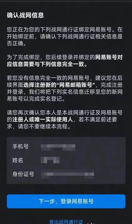 请先确认好待绑定的战网通行证信息,接着点击“下一步”按钮,之后登录你的网易账号。