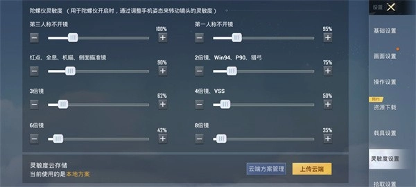 陀螺仪灵敏度设置参数如下: - 第三人称不开镜:100% - 第一人称不开镜:95% - 红点瞄准镜、全息瞄准镜、机械瞄准、侧面瞄准镜:90% - 2倍瞄准镜、Win94、P90、猎弓:75% - 3倍瞄准镜:62% - 4倍瞄准镜、VSS:50% - 6倍瞄准镜:42% - 8倍瞄准镜:35%