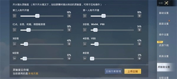 镜头灵敏度设置如下:第三人称不开镜状态下为120%;第一人称不开镜时是110%;红点瞄准镜、全息瞄准镜、机械瞄准镜以及侧面瞄准镜的灵敏度均为40%;2倍镜、win94、p90和猎弓对应的灵敏度是30%;3倍镜设置为20%;4倍镜与vss的灵敏度为15%;6倍镜调整至8%;8倍镜则是5%。