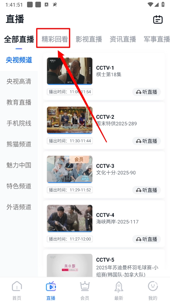 进入直播页面切换至"精彩回放"。