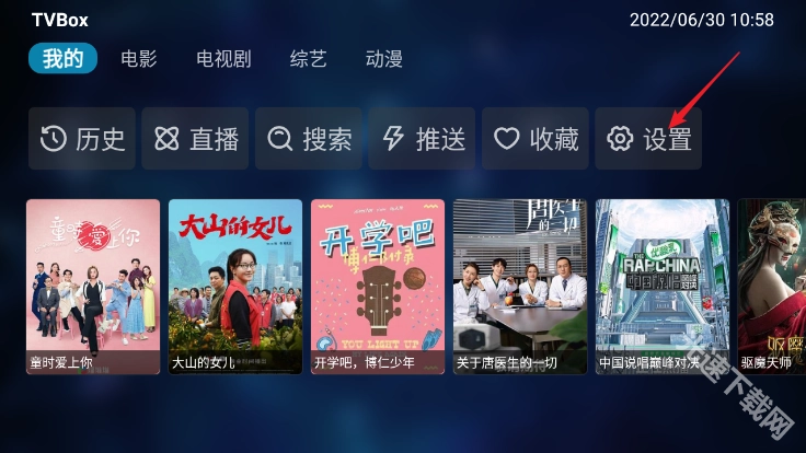 进入tvbox后,在首页点击设置;