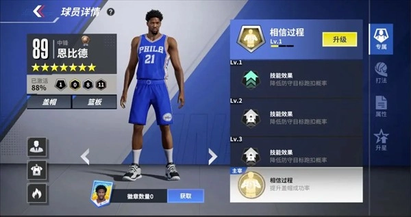 ●3星:○打法特色:当升级新秀恩比德达到3星时,将解锁主宰技能,其盖帽能力会得到进一步提升,同时还会解锁抓帽技能!