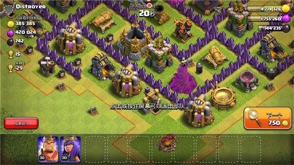 进攻时建议只训练哥布林、野蛮人(黄毛)和弓箭手(弓箭MM),三者的比例控制在2:1:1。哥布林的核心优势是高效掠夺资源,搭配野蛮人及弓箭手是为了辅助哥布林推进;我们的抢劫策略聚焦于敌方基地外围的资源采集器。搜索到对手后,先查看左上角的资源总量,再观察采集器的分布位置(参考图示)。若有机会达成50%的摧毁度,尽量打到这一目标,这样既能获取星星奖励,又能掠夺资源,实现双赢。即便无法达到50%摧毁度也无需灰心,只要成功获取资源即可。
