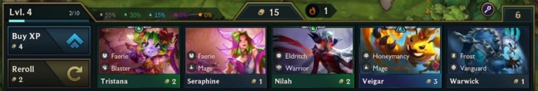 在下图中,我们能看到两只1星的莉莉娅,其中一只位于替补席。接着,商店会刷新出第三个莉莉娅,它会被特别标注出来,以此提示玩家:购买这个莉莉娅后,就能把这三只莉莉娅合并成一只2星的莉莉娅。