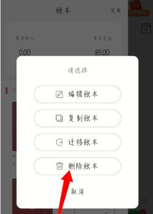 弹出的操作菜单中,选择“删除账本”选项。