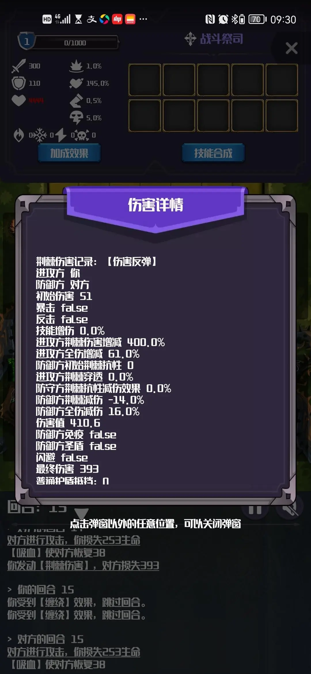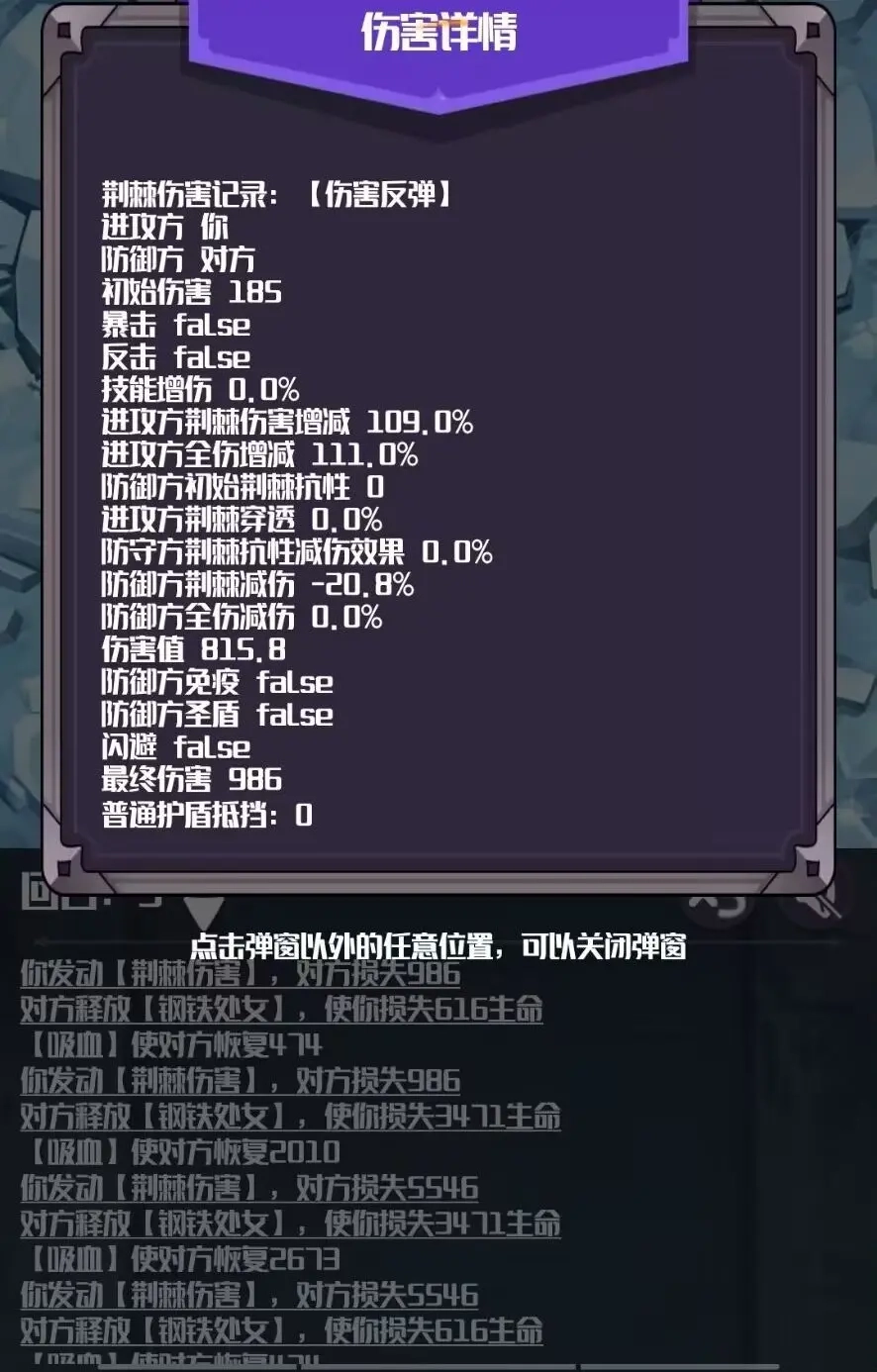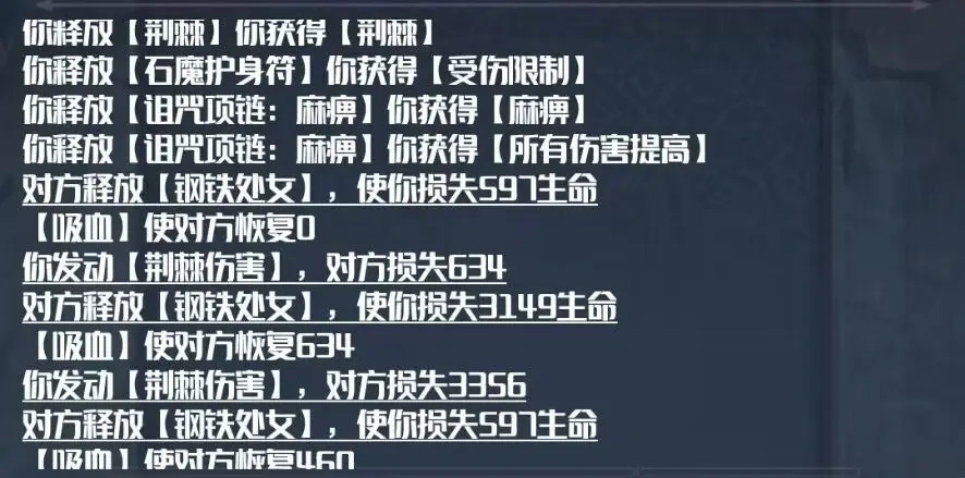 这个游戏的流程是从回合0开始的:回合0阶段双方会先叠加一系列被动状态,之后才进入回合1正式战斗。也就是说,这些被动状态并非角色或怪物初始自带的属性,而是战斗开始后在回合0阶段逐个附加的。问题出在回合0时,我们给自身施加麻痹项链的麻痹效果或禁疗状态时,意外触发了对方的钢铁处女机制——此时我们还有不少被动状态没来得及加上,就被对方趁机白嫖输出打掉大量血量,更糟的是,荆棘项链的反伤效果可能还没生效,导致无法反击反伤。