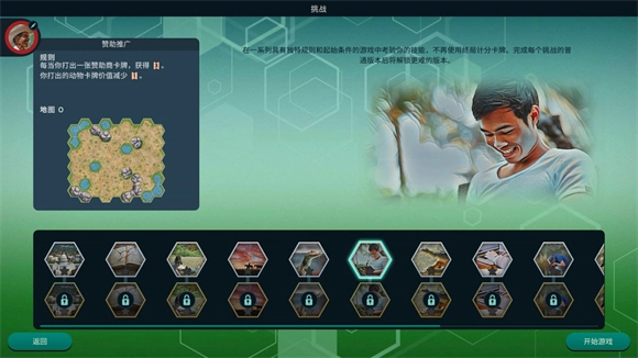 研究任务的规则是:普通难度开局时动物园自带科学博物馆;困难难度同样开局有科学博物馆,但初始资金减少到15。这是个难度很低的挑战——科学博物馆的效果是每个科学图标额外提供1点盾,这意味着以前需要争抢的2盾升级、解锁人员,以及5盾、8盾的奖励,在这个模式里都能轻松拿到;要是开局能凑到更多科学图标,刷高分更是轻而易举。不过这个挑战有个需要注意的点:容易缺钱。毕竟盾和大部分科学类赞助商都没法直接转化为收入,而完成任务又需要稳定的经济支撑。只要能规划好开局的17块钱,这个挑战就能玩成纯粹的爽局。推荐选择冰淇淋店、好莱坞山这两张地图。