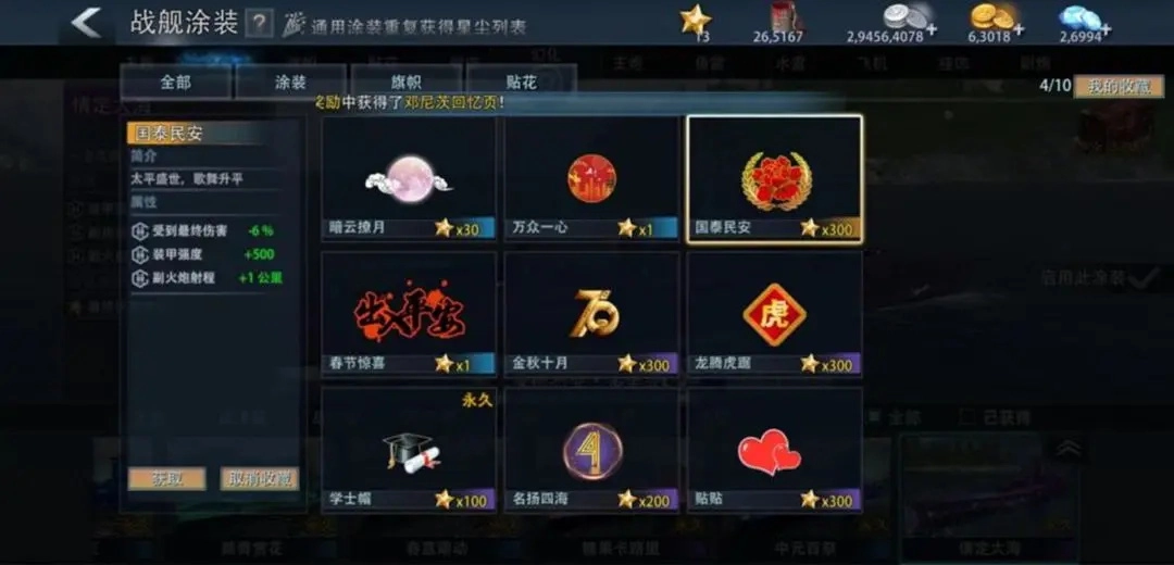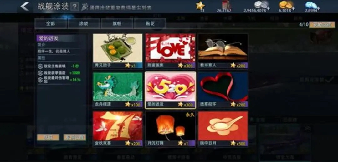 战役类旗帜里,首推“爱的迸发”——也就是大家常说的520旗帜,它绝对是性价比最高的,没有之一。这次推荐的这5个旗帜,基本都偏向战役属性;虽然装甲属性对驱逐舰、潜艇来说稍显勉强,但也并非完全不能用,还请单系玩法的玩家不用过于较真。需要说明的是,这里提到的“战役内”指的是纯战役场景生效的属性,在天梯常规模式下是无效的,天梯玩家要留意这一点。另外,涂装、旗帜、贴花的截图里,那些标注100星尘和1星尘的,是在100抽过程中概率赠送的;这些道具拿到后可以使用,属性都不错,但由于是随机获取的,就不单独列举了。 ①爱的迸发(旗帜):五系通用,战役内效果为——主炮装填-1、装甲+1000、终伤+14% ②碗中日月(旗帜):五系通用,战役内效果为——主武装填-5%、装甲+1000、伤害+8% ③结草衔环(旗帜):五系通用,效果为——鱼雷减伤8%、爆伤+8%、装甲+500 ④甜蜜画集(旗帜):五系通用,效果为——规避+8%、航速+1.5、装甲+500 ⑤教书育人(旗帜):五系通用,效果为——精度+10%、主炮射程+0.5、装甲+550