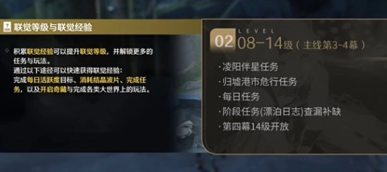 主线第三幕已完成,第四幕需等级达到14级方可开启,此时会出现主线等级卡关的情况。不过与此同时,游戏内解锁了大量新任务。建议优先完成“凌阳:伴星”和“危行任务:归墟港市”这两个重要任务(后者无需手动跑图,系统会自动传送至任务地点),之后再领取漂泊日志中的经验奖励,这样基本能顺利达到14级。这段时间内依旧不用过多关注其他支线任务,经验获取是比较充足的。3.联觉等级14-21级,