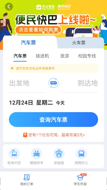 巴士管家作为一款覆盖多方面需求的出行服务平台,给我们的日常通勤和外出游玩带来了诸多便捷,能够提供高效又便捷的出行解决办法,让每一次出行都变得十分轻松!平台涵盖了多种出行方式,像火车票、汽车票、机票等都包含在内,我们可以根据自己的需求随意选择,而且通过平台就能随时随地预订车票,不用再去排队等候。另外,平台还有行程规划的功能,能智能地为我们推荐性价比最高的出行方案!