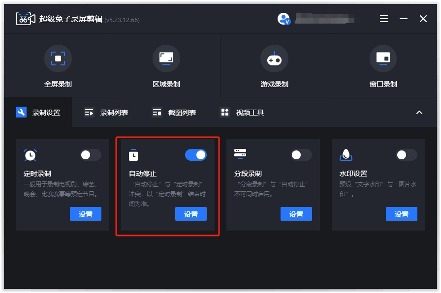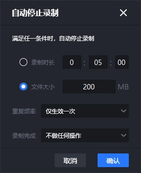 支持用户把录制时长或视频大小设定为录制自动停止的触发条件。用户开启该功能后,当录制的视频满足预设条件时,录制就会自动终止。