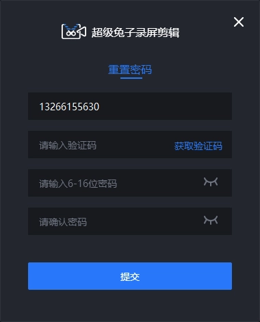 在密码登录的弹窗里,点击“忘记密码?”就能打开重置密码的弹窗。接着输入账号对应的手机号、新设置的密码以及验证码,之后点击提交按钮,就能完成账号密码的重置操作了。