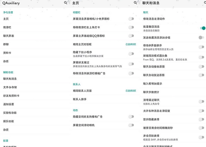 QAuxiliary是一款适用于QQ和TIM的扩展模块,您只需点击QQ或TIM设置里的QAuxiliary选项,就能进入该扩展辅助软件的设置界面,进而使用防撤回、清理最新聊天记录、简化聊天气泡样式、调整联系人排序等多种实用功能。