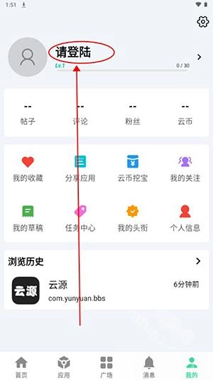 首先前往魔趣网并安装云源软件。进入首页后,点击右下角的“我的”按钮。