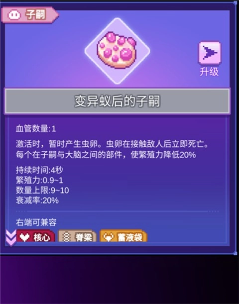 首先要说明的是,翅、腹与毒囊除了自身原有的效果外,还能当作增幅组件使用。要是在它们的右侧相邻位置连接脊髓、肺或者肠道,就能让被施加了对应状态效果的单位,像子嗣那样定时触发右侧相邻的器官。这一点需要被施加状态效果的单位和状态效果始终保持存在才行。另外,肺和肠道能够在一定范围内对多个单位施加状态,这也能带来效果翻倍的作用。翅的作用对象是角色或者子嗣,数量相对而言是比较容易控制的。这也是子嗣章节里提到的蚁后优势之一,蚁后的数量上限高,能获得翅效果的单位自然就多,增幅的倍率也就更高。腹和毒囊的作用对象是敌人,敌人的数量上限比我方多很多,理想情况下能起到比翅更高的增幅效果,但敌人除了单次作用的数量不好控制外,还存在可能被状态效果本身或者右侧其他器官杀死的问题,而且说到底游戏的目的就是尽快消灭敌人,所以以敌人存活为前提的增幅必然会有自限性。