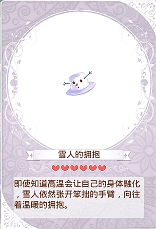 紫色的帽檐上方,是一张雪白的雪人脸庞。它那棕色的眼睛虽不算明亮有神,却隐隐透着一丝孤寂。红色的鼻子,看着像是一截小小的胡萝卜。棕色的嘴巴微微咧开,仿佛是瞧见了什么新奇的事物。它伸展开两条手臂,似要在凛冽的冬日里,给你一个暖洋洋的拥抱。“即便清楚高温会令自己的身躯消融,雪人依旧张开笨拙的臂膀,憧憬着温暖的相拥。”