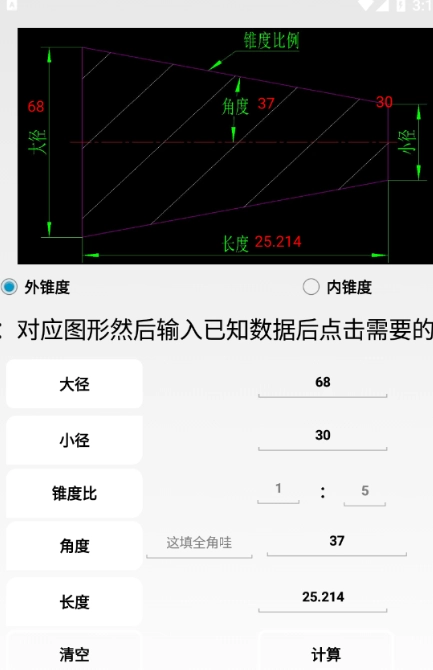 在锥度计算界面中,输入大径、小径、锥度比等相关数据后,系统便能完成外锥度与内锥度的计算。