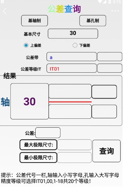 在公差查询界面,只要输入基本尺寸就能开展公差计算。
