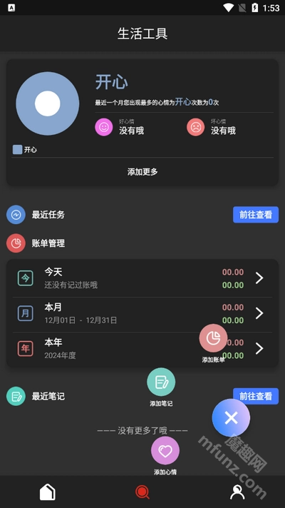 生活工具涵盖添加心情、记录任务与账单、添加笔记等功能。