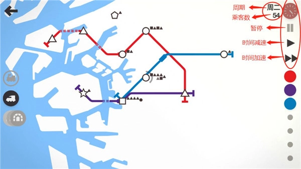 ③ 换乘枢纽:设置换乘枢纽能够提升地铁站点的乘客承载量,防止站点因过早出现拥堵状况而致使游戏提前结束。