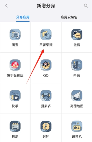 添加应用的步骤如下:首先在主界面找到“新增分身”按钮并点击,接着在已安装应用列表里找到“王者荣耀”,最后点击添加即可。