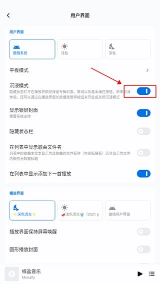 在用户界面设置里,找到沉浸模式选项,点击它右侧的开关按钮,具体操作可参照图示: