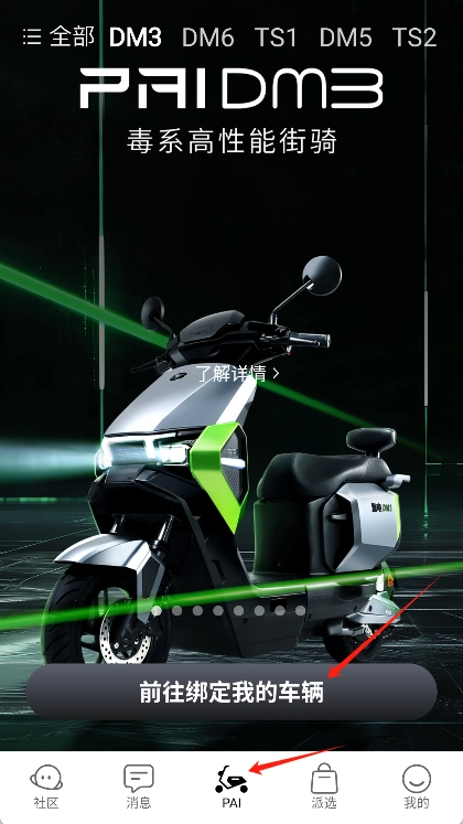 添加电动车的操作步骤如下:在底部导航栏找到“PAI”选项并点击,随后点击“前往绑定我的车辆”。