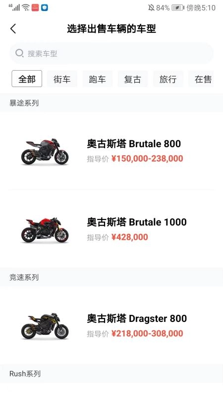 选择出售车辆的车型时,可从街车、跑车、复古车、旅行车、在售车等分类中挑选,也能直接搜索目标车型。