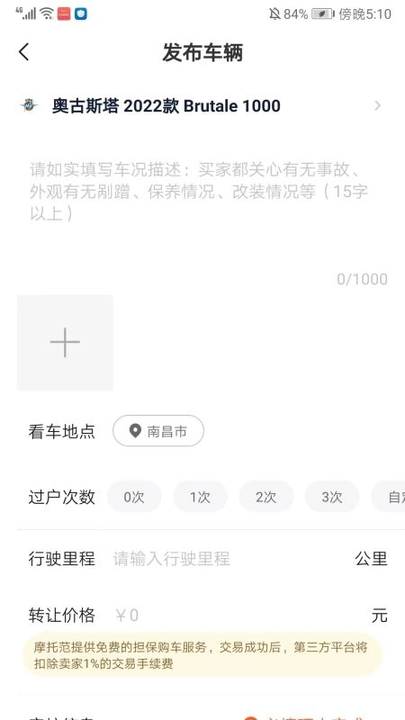 进入发布车辆的界面后,按顺序填写车况相关说明、过户次数、行驶里程、转入价格和联系方式,最后点击【发布】按钮,就能完成卖车操作了。