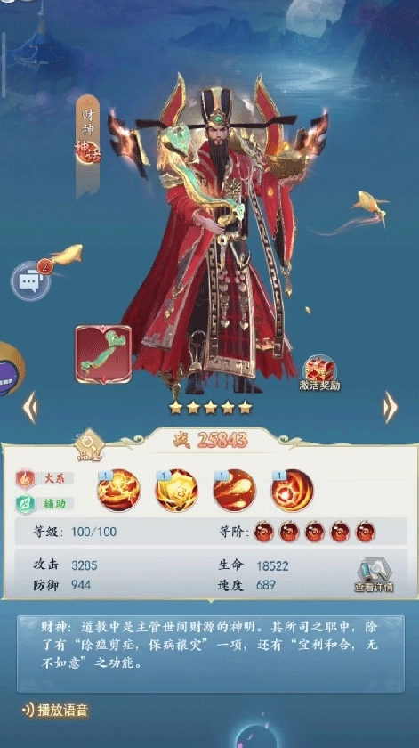 接下来要介绍的第二位角色,是游戏里的万能治疗辅助之一——财神爷。他能和前面提到的哪吒组成火系队伍搭配使用。作为辅助职业,财神爷也能在其他队伍中发挥作用,作为间接辅助登场。他的基础属性面板表现相当出色,尽管攻击力稍低,但辅助角色本就不需要承担主攻任务,只要具备良好的防御力和生命值就足够了。