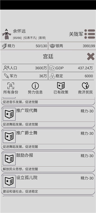 首先要解决的是资金问题,一旦攒够100万,就得立刻去宫廷解锁和觉醒相关的政策,这个步骤宜早不宜迟;要是暂时没有合适的政策可解锁,那就先去钻研艺术领域。